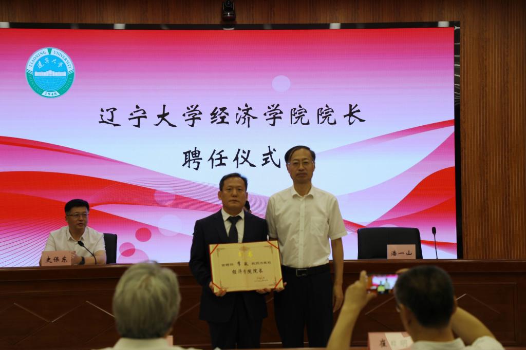 潘一山校长宣读了学校聘任文件,并为经济学院院长李政颁发聘书。